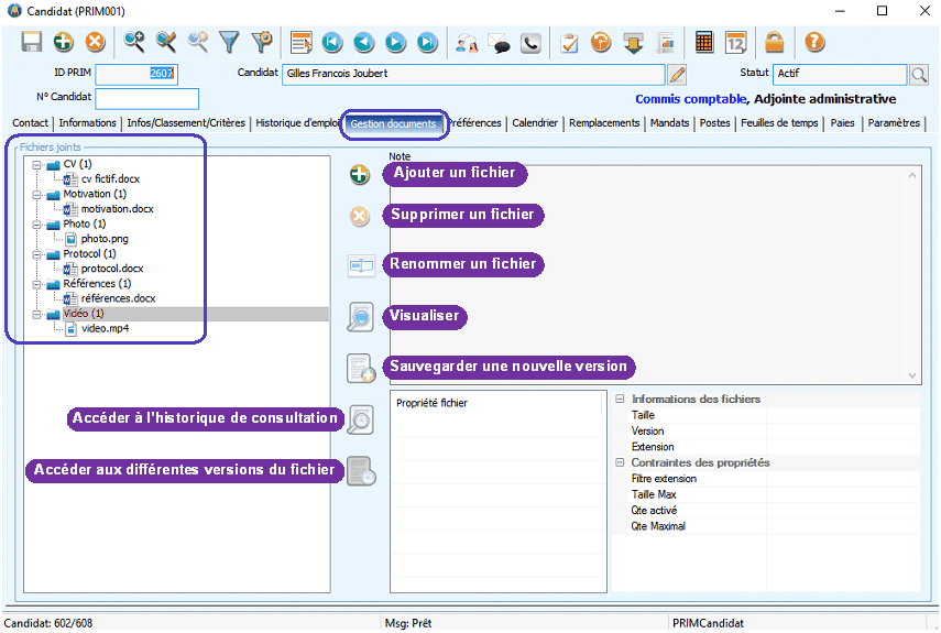 L'onglet « Gestion documents » se retrouve dans plusieurs fenêtres de PRIM, telles que « Client », « Candidat », « Employé » et « Division » et regroupe tous les documents pertinents au dossier.