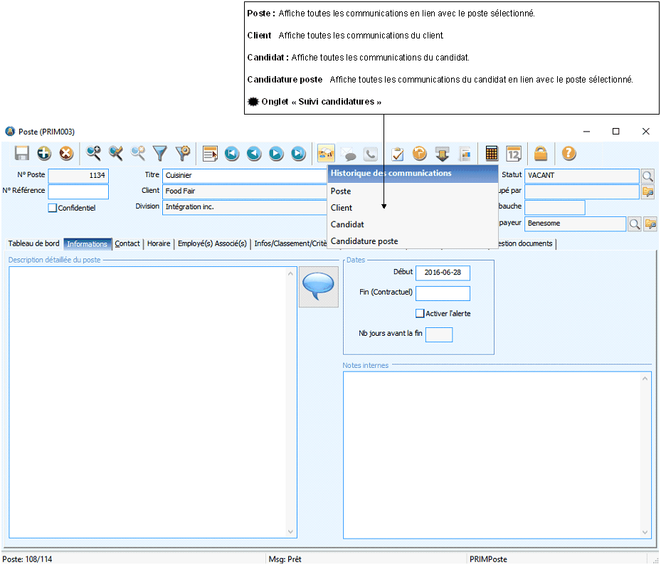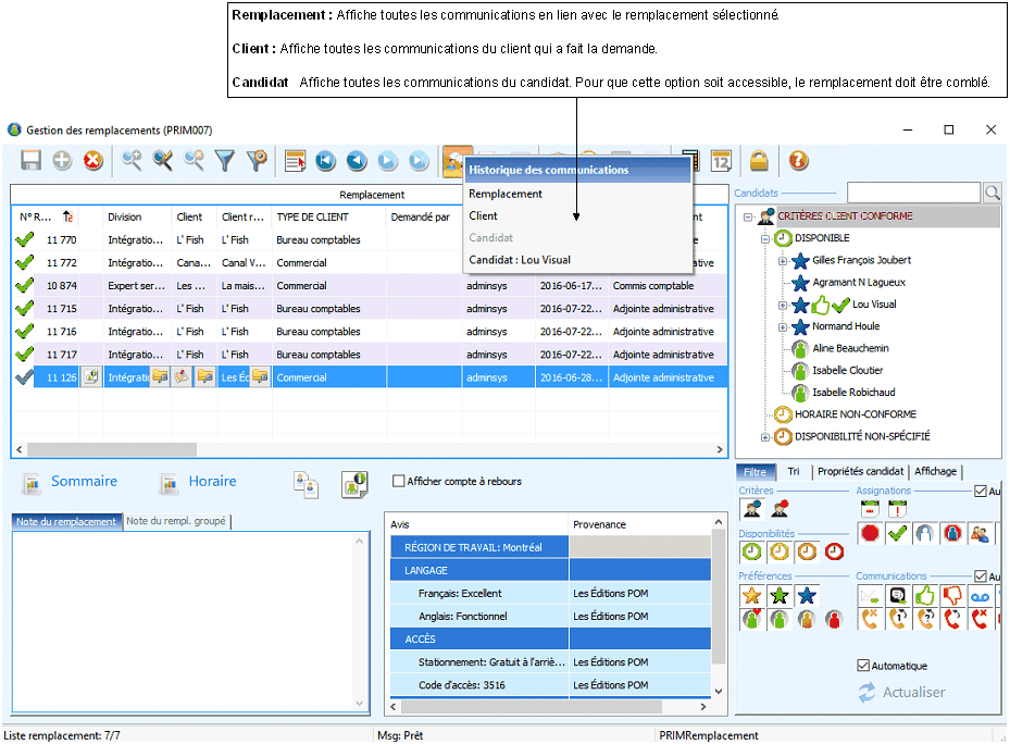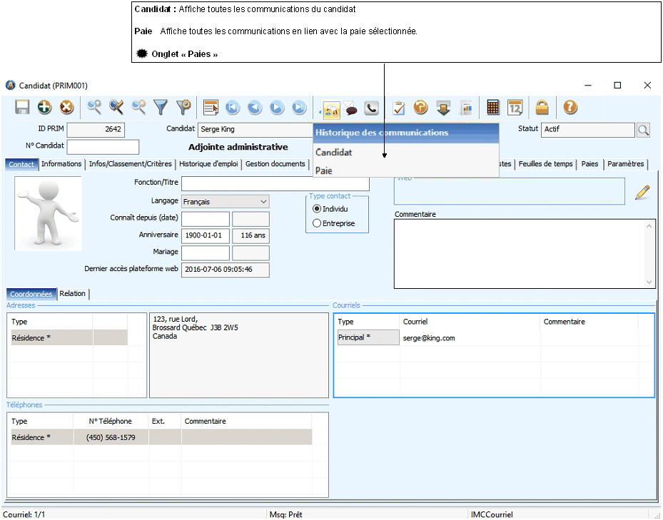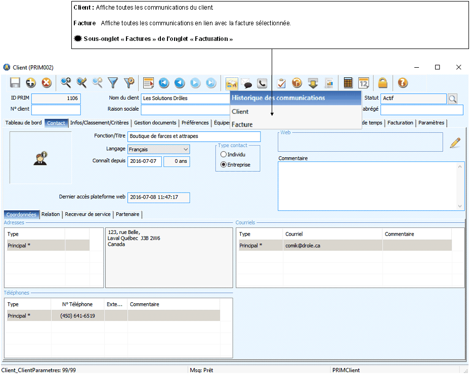 Il est possible de consulter l'historique des communications depuis différentes fenêtres de PRIM, voici quelques exemples.