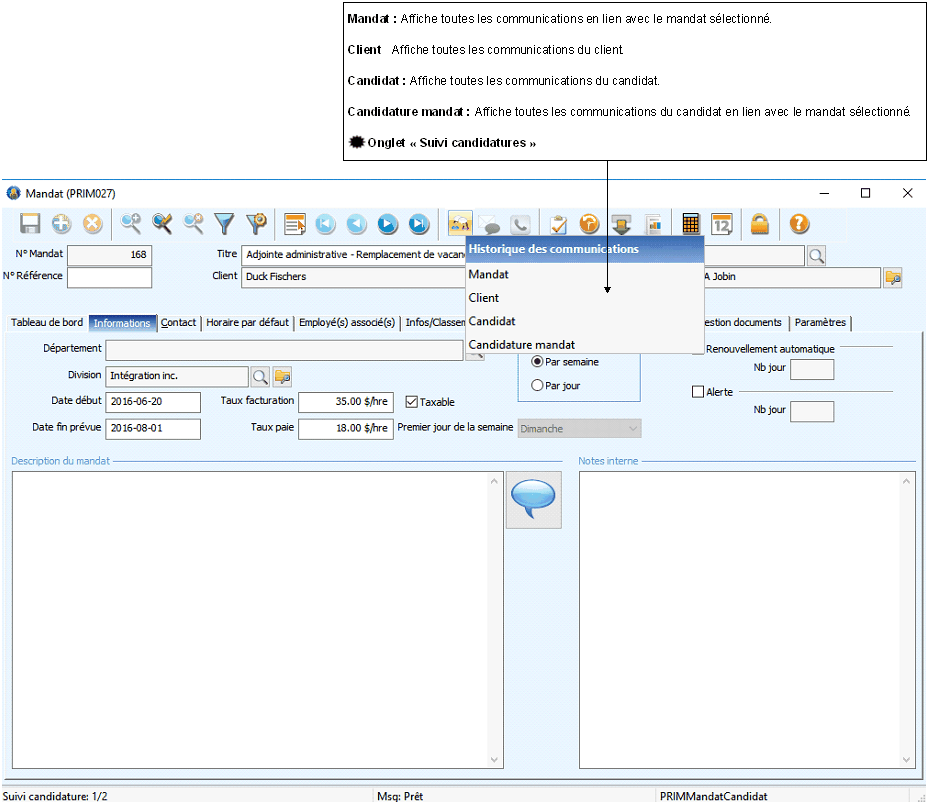 1.Ouvrez une fenêtre « Mandat ». 2.Cliquez sur (Historique des communications) de la barre d'outils principale, sélectionnez un élément de la liste pour afficher la fenêtre « Historique des communications ».