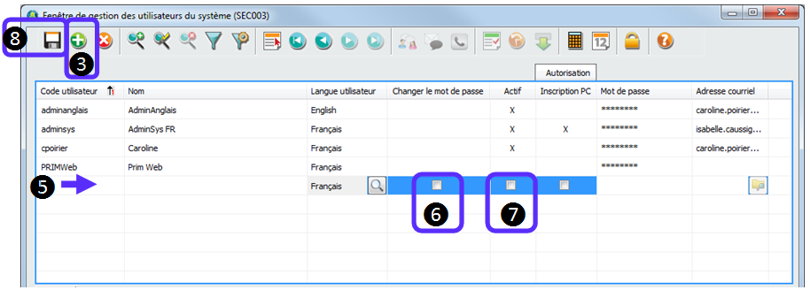 5.Complétez les champs : « Code utilisateur », « Nom », « Mot de passe », « Adresse courriel ».