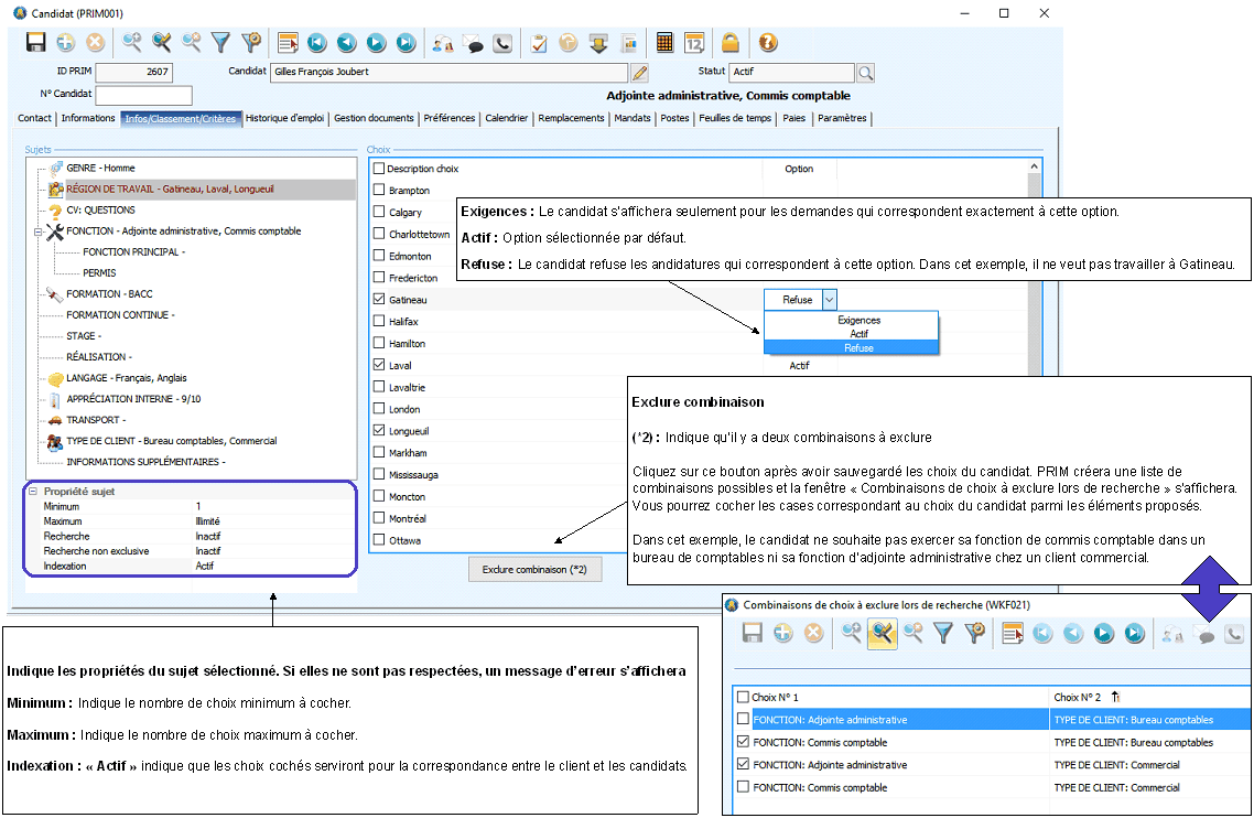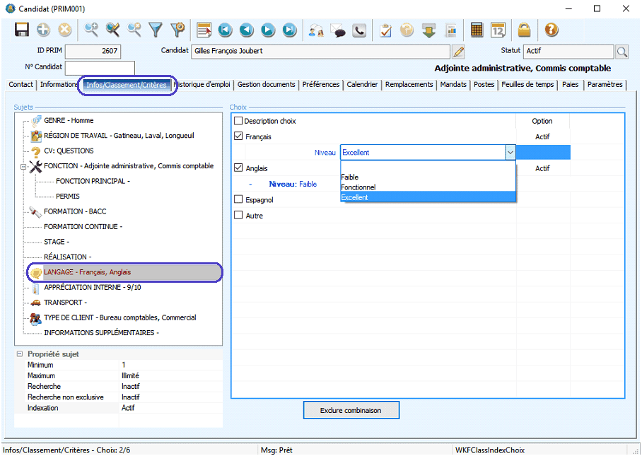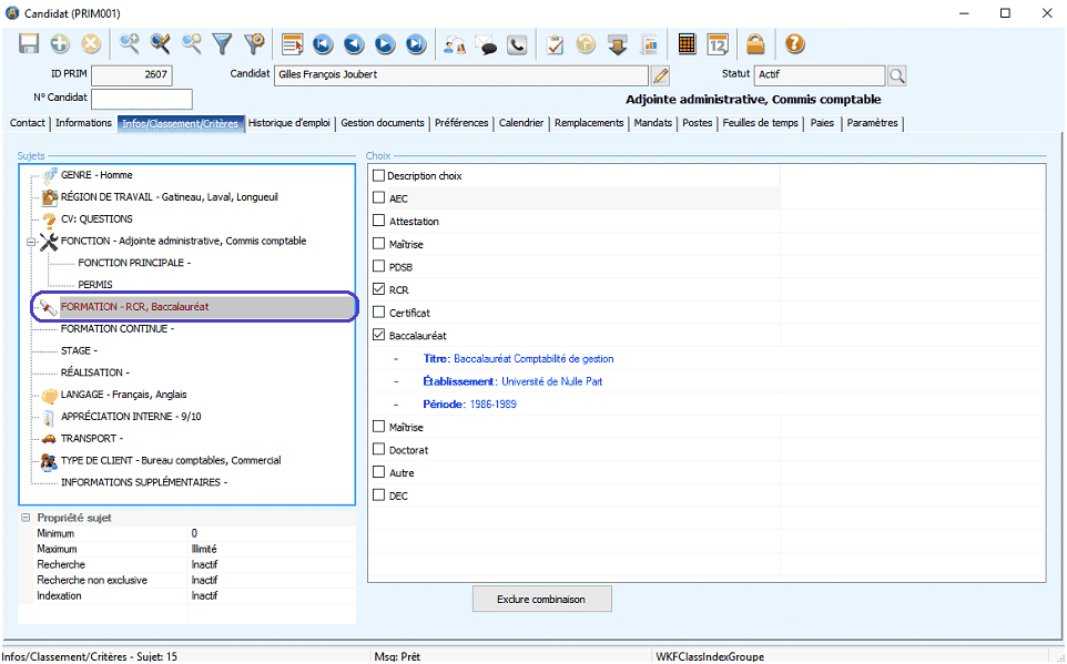 L'onglet « Infos/Classement/Critères » regroupe des informations sur le candidat, par exemple, sa profession et les diplômes obtenus.