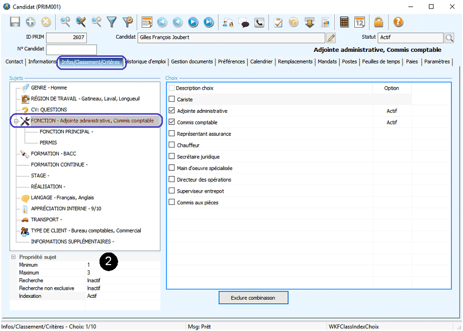 1.Dans la zone « Sujets » cliquez sur « FONCTION ». 2.Dans la zone « Choix » cochez la ou les fonctions exercées par le candidat. Dans l'exemple, la zone des propriétés indique que vous pouvez cocher un maximum de 3 fonctions. 3.Cliquez sur l’icône