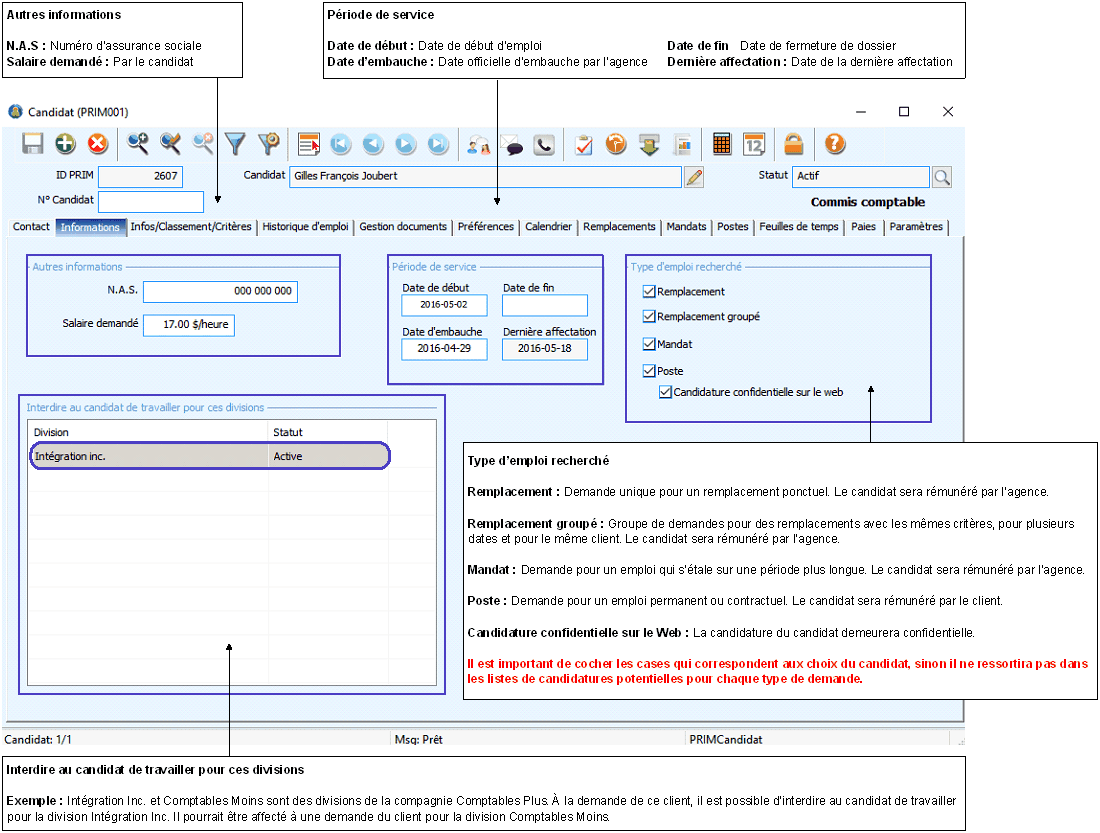 L'onglet « Informations » contient les informations reliées à l'embauche et le type d'emploi recherché par le candidat.