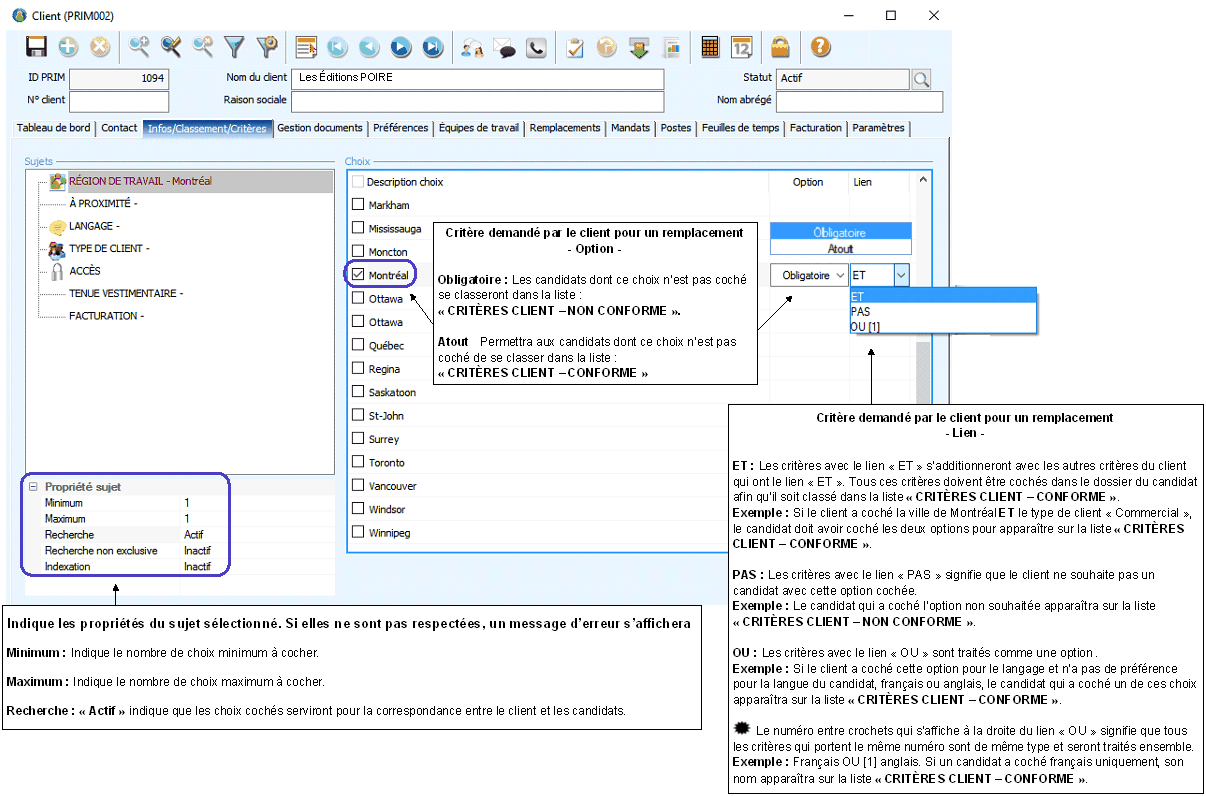 Il contient aussi les critères demandés par le client qui serviront à PRIM pour trouver des correspondances avec les candidats pour un remplacement.