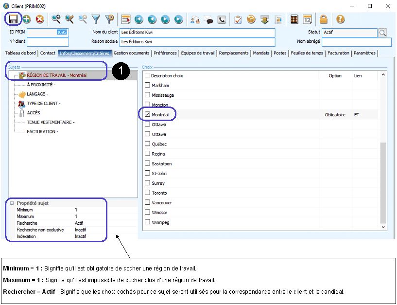 1.Dans la zone « Sujets » cliquez sur « RÉGION DE TRAVAIL ». 2.Dans la zone « Choix » cochez la région géographique où se situe le client. 3.Cliquez sur l’icône