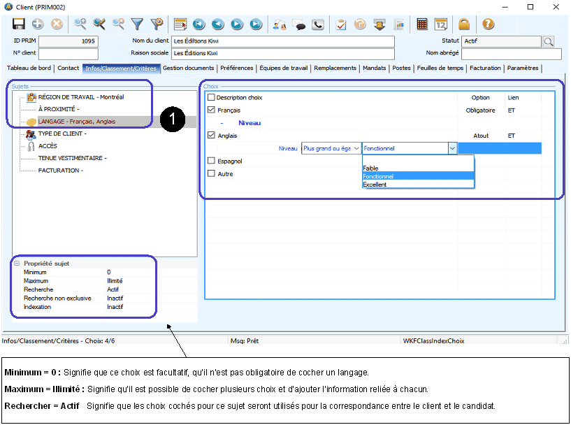 1.Dans la zone « Sujets » cliquez sur « LANGAGE ». 2.Dans la zone « Choix » cochez le ou les langages utilisés dans le milieu de travail du client. 3.Les options pourront être modifiées, s'il y a lieu. 4.Dans cet exemple, on recherche un candidat qui doit absolument parler français (l'anglais sera considéré comme un atout). Dans le résultat de la recherche pour la correspondance, le candidat qui ne parle pas français s'affichera dans la liste des « CRITÈRES CLIENT – NON CONFORME », ce critère étant obligatoire. 5.Cliquez sur l’icône