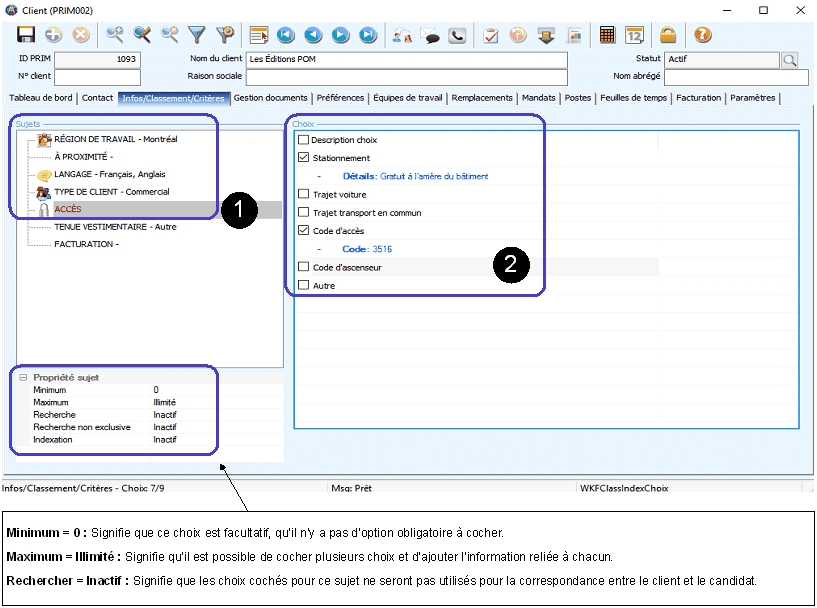 L'onglet « Infos/Classement/Critères » regroupe des informations supplémentaires à propos du client.