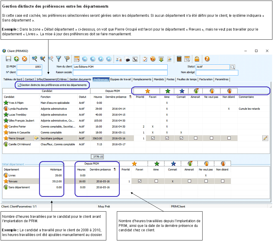 L'onglet « Préférences » rassemble les appréciations du travail, soit du client envers le candidat ou du candidat envers le client, c'est pourquoi les deux sont traités conjointement.