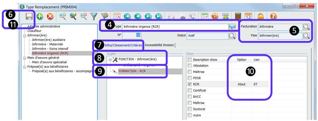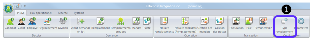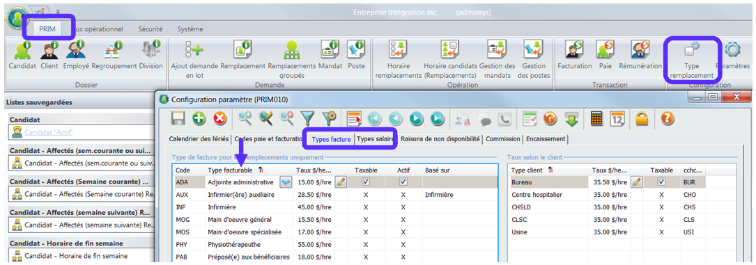 Avant de créer un type de remplacement assurez-vous qu’un type de salaire et de facturation existe. Pour se faire cliquez sur le ruban PRIM/Dossier Paramètres/Onglets (types facture, types salaire). Un liensera fait avec le type de salaire et le type de facture.