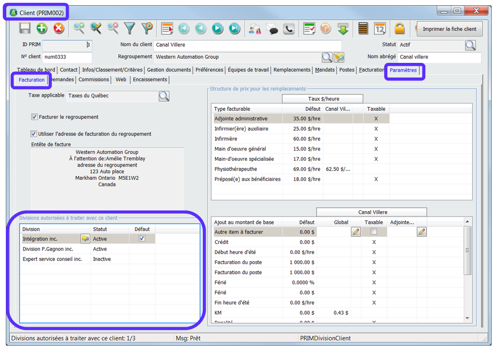 Dans le dossier client, dans l’onglet « Paramètre facturation » assurez-vous que la division est autorisées à traiter avec le client qui fera les demandes de ce type de remplacement.