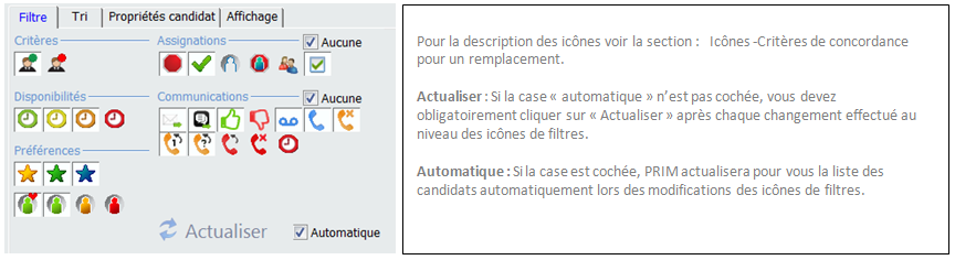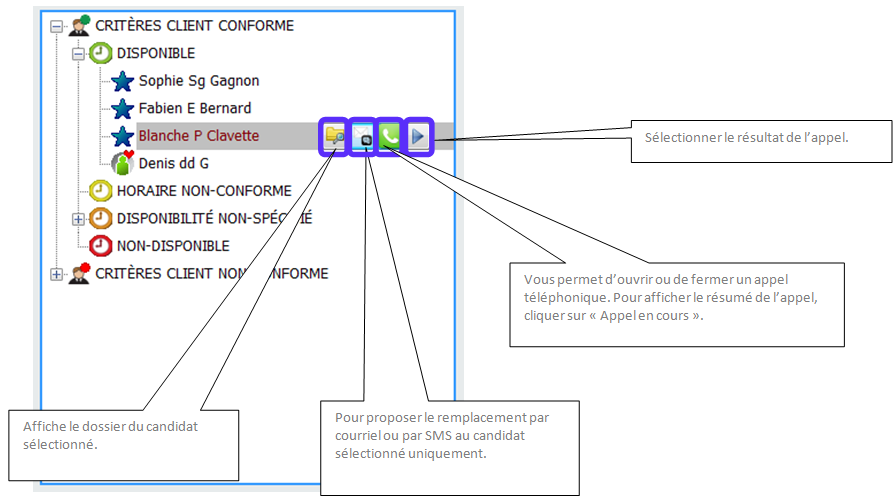 Vous permet de filtrer l’arborescence des candidats pour accélérer votre travail. Sélectionnez les icônes qui font que vous voudriez voir apparaître le candidat dans la liste. Par exemple, dans l’image ci-dessous, on ne veut pas voir les candidats qui sont non-disponibles ou qui ont refusé le remplacement. Pour sélectionner un icône, cliquez dessus pour que celui-ci devienne enfoncé et blanc.