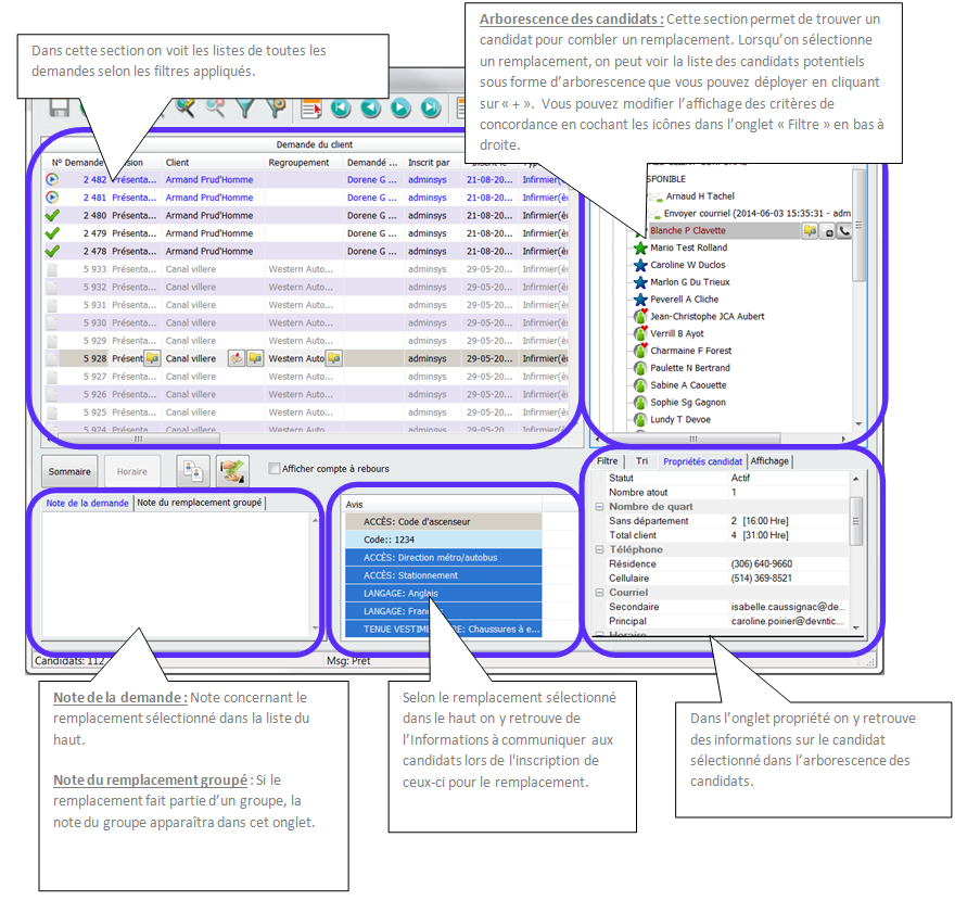 L’attribution des candidats aux remplacements s’effectue dans cette fenêtre. On y voit tous les remplacements demandés par les clients, les candidats que l’on pourrait inscrire pour ces remplacements, les candidats qui sont déjà affectés, les avis que l’on doit communiquer aux candidats, etc.