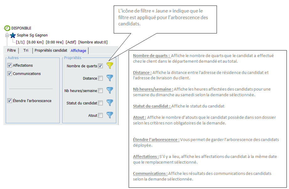 Vous permet de configurer l’affichage de l’arborescence des candidats. Cliquez sur les cases à cocher pour afficher les informations.