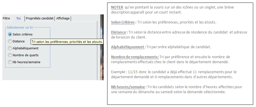 Vous permet de sélectionner un tri pour l’arborescence des candidats. Noter que le tri s’effectue dans chaque bloc de critères et de disponibilité