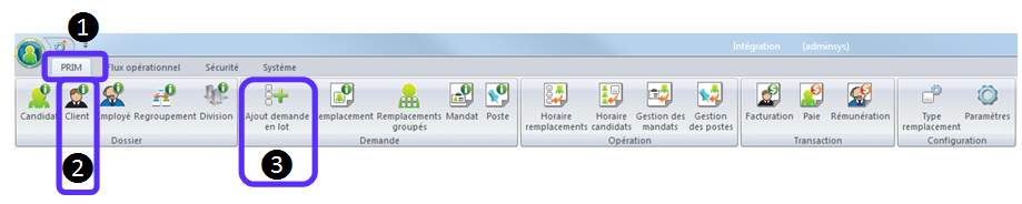 Vous pouvez aussi y accéder directement à partir du ruban "PRIM", dossier "Ajout demande en lot".