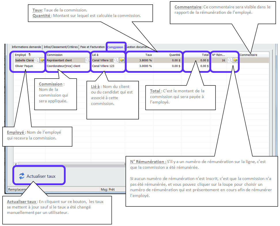 La commission est insérée automatiquement à la création de la demande et/ou à l’affectation du candidat. L’association des taux doit être faite pour que la commission soit insérée automatiquement. Si l’association des taux a été faite après la création de la demande, vous devrez insérer manuellement la commission dans l’onglet «Commission».