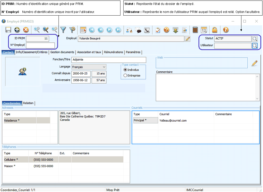 Peu importe dans quel onglet vous naviguerez, la section du haut sera toujours identique, elle affiche l’information générale à propos de l'employé.
