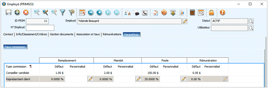 L'onglet « Paramètres » permet à l'employé de visualiser les informations reliées au taux de commission qui a été configuré pour chacun des types de demande.