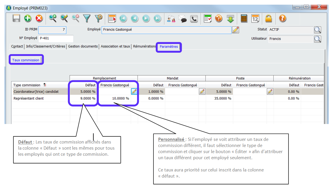 Il est possible de configurer des commissions qui s’appliqueront sur les remplacements, les mandats, les postes, ou de façon générale. Dans l’onglet paramètres du dossier employé, on vient indiquer quels types de commission peut recevoir l’employé.