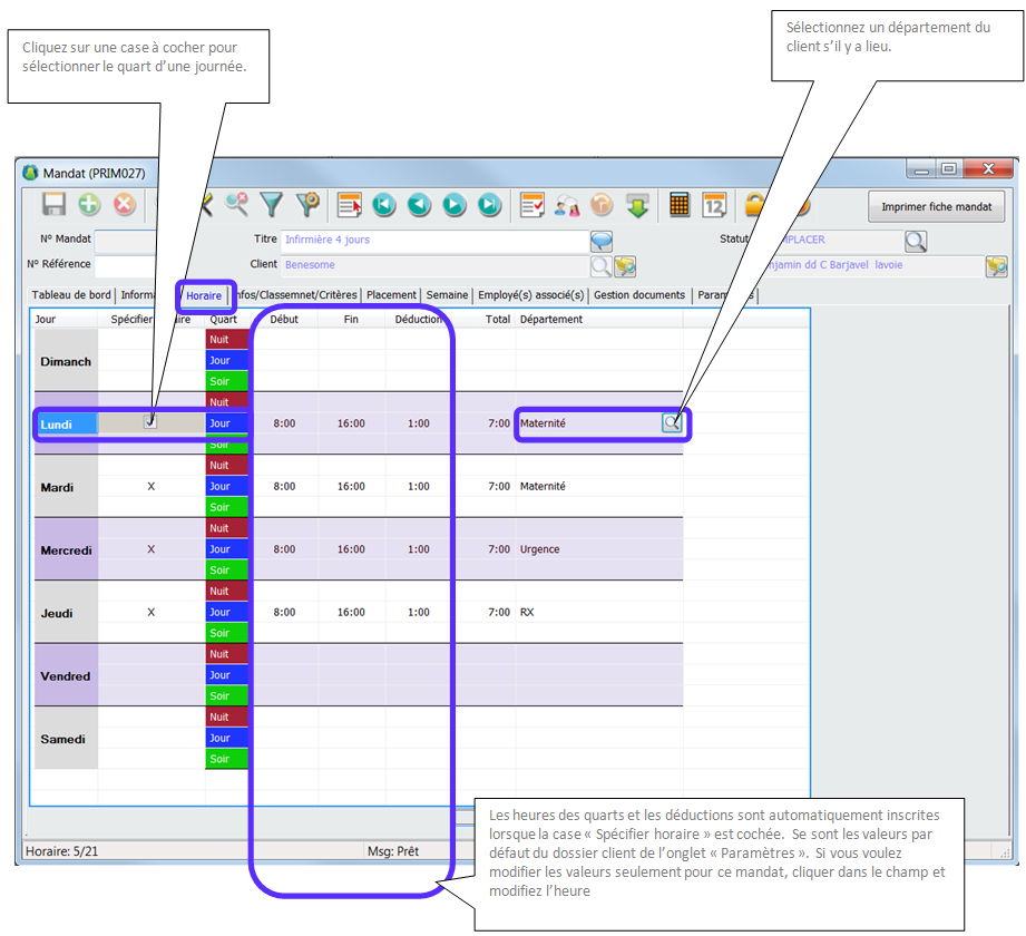 L’horaire par défaut ainsi que la date de début et de fin du mandat permettent de déterminer les conflits d’horaire du candidat affecté. S’il n’y a aucune date de fin inscrite dans le mandat, le candidat sera considéré en conflit d’horaire jusqu’à la dernière journée travaillée pour le mandat.