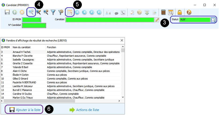 1.Dans le menu « PRIM », cliquez sur le bouton 2.Les champs sont verts vous êtes en mode recherche. 3.Recherchez tous les candidats qui ont le statut « Actif ». Vous pouvez écrire « Actif » dans le champ « Statut » ou cliquer sur l'icône 4.Cliquez sur l’icône 5.Cliquez sur l’icône 6.Cliquez sur
