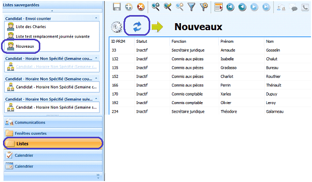 1-Cliquez sur le volet « Listes ». 2-Sélectionnez la liste que vous désirez actualiser et cliquez sur l’icône 3-Dans l'exemple ci-dessous, tous les candidats étaient inactifs lors de la création de la liste. Si leur statut a changé par la suite, ils n’apparaîtront plus dans la liste.