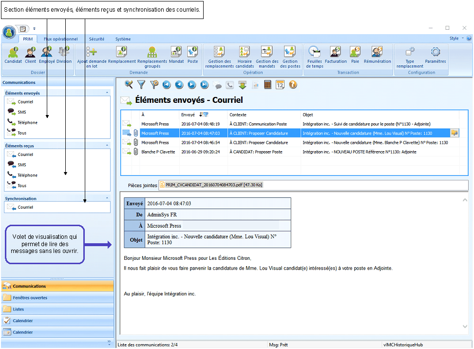 Le volet des communications permet d'afficher les communications émises et reçues de l'utilisateur, appel téléphonique, courriel ou SMS et de synchroniser les courriels reçus dans Outlook vers PRIM. Il est accessible en cliquant sur « Communications » en bas à gauche de l'écran.