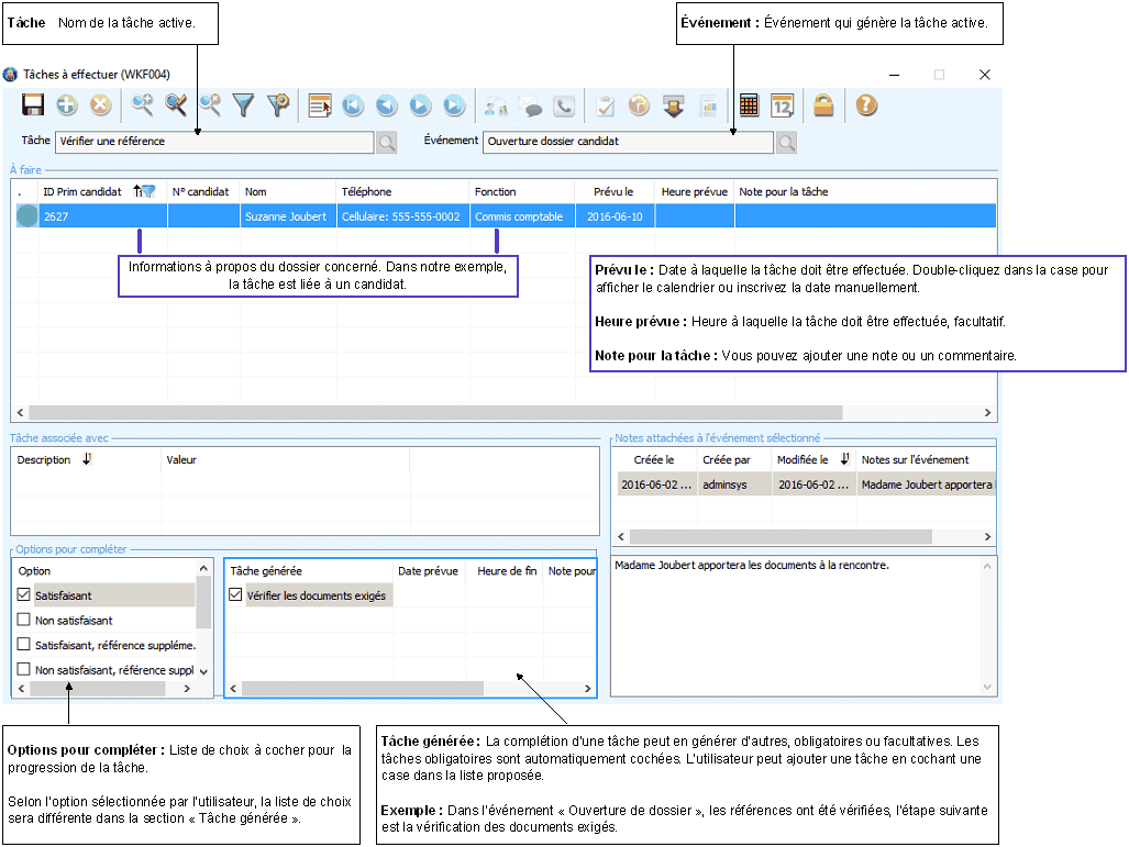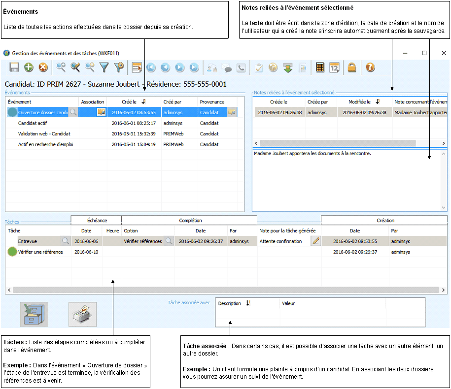 La fenêtre « Gestion des événements et des tâches » s'ouvre à partir du dossier d'un candidat ou d'un client. Cliquez sur l'icône