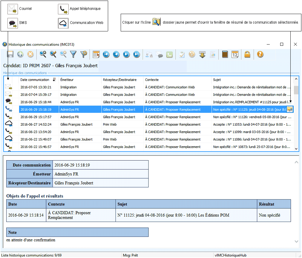 La fenêtre « Historique des communications » permet la consultation de toutes les correspondances reliées à l'enregistrement sélectionné, elle est accessible par tous les utilisateurs de PRIM de votre entreprise.