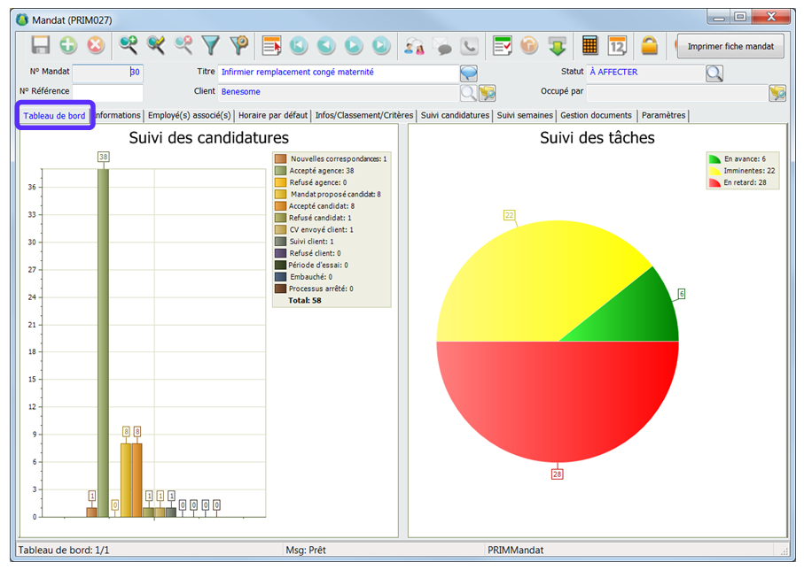 Le tableau de bord vous donne un aperçu général du mandat concernant le statut de placement des candidatures et des tâches qui y sont liées.