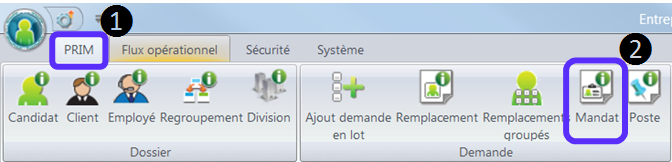 1.Pour accéder aux mandats, cliquez sur le ruban « PRIM ».