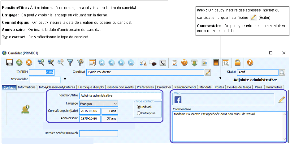 L'onglet contact contient les informations de base du candidat telles que ses coordonnées, liens vers réseaux sociaux, langage, etc.