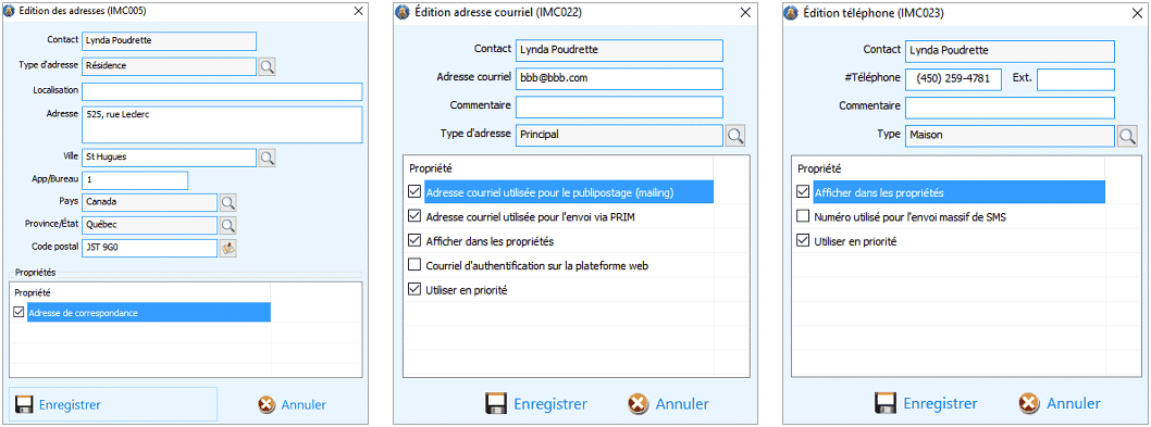 Fenêtres d'édition du sous-onglet « Coordonnées »
