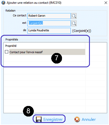4.La fenêtre « Gestion des contacts » s'affiche. 5.Recherchez le contact dans la liste en inscrivant son nom dans le champ « Nom », cliquez sur l'icone 6.Cliquez sur 7.La fenêtre « Ajouter une relation au contact » s'affiche. Cochez les propriétés que vous désirez attribuer à ce contact.