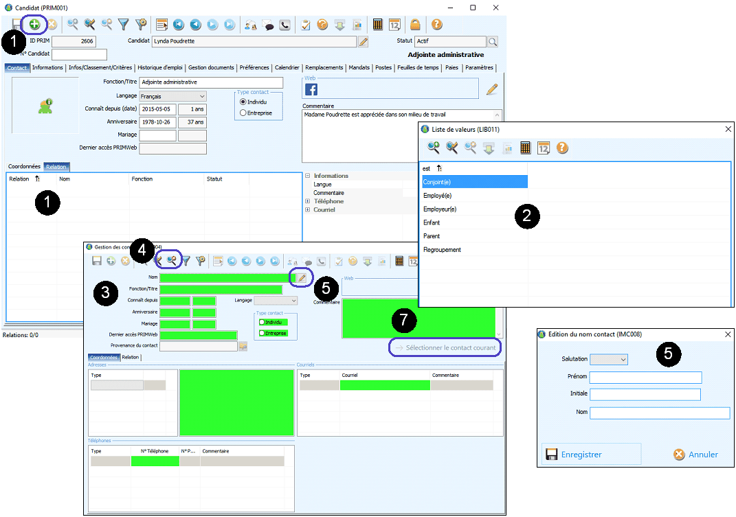Dans l'exemple ci-dessous, nous ajouterons une relation de type individu, qui n'existe pas encore dans PRIM. 1.Dans le dossier du candidat, sélectionnez le sous-onglet « Relation ». Dans la zone, cliquez sur une ligne blanche ou sur l'icône 2.La fenêtre « Liste de valeurs » s'affiche. Choisissez parmi les éléments proposés. 3.La fenêtre « Gestion des contacts », s'affiche. 4.Cliquez sur l'icône 5.Cliquez sur l'icône 6.Cliquez dans les différentes zones d'édition de la fenêtre « Gestion des contacts » où vous désirez ajouter de l'information. Cliquez sur 7.Cliquez sur le bouton 8.Le contact s'affiche dans la zone « Relation ».