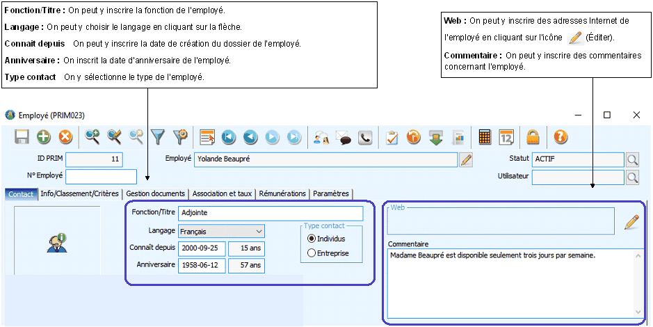 L'onglet « Contact » permet de créer un dossier ou de modifier des informations contenues dans le dossier d'un employé.