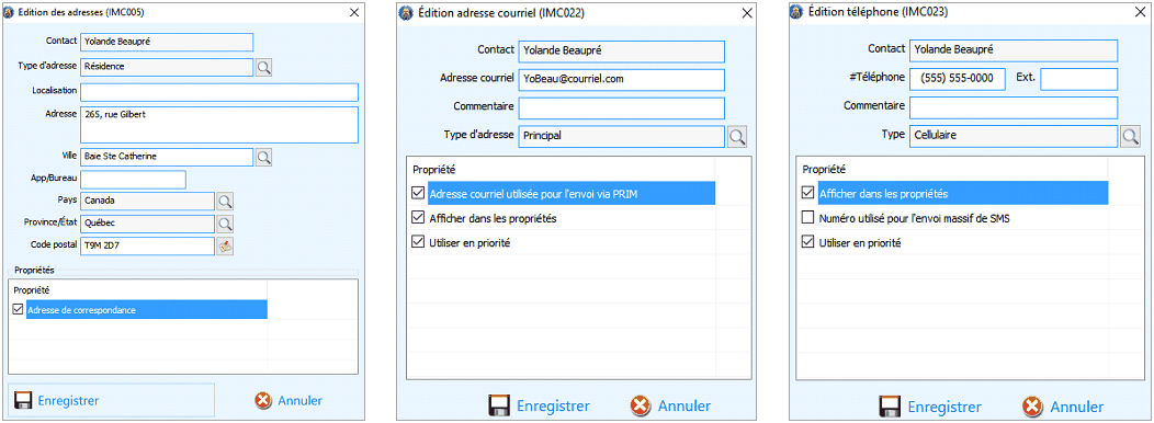 Fenêtres d'édition du sous-onglet « Coordonnées »