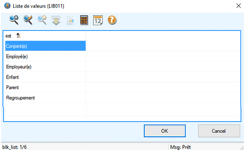 1.Cliquez sur le sous-onglet « Relation ». 2.Dans la zone, cliquez sur une ligne vide, la fenêtre « Liste de valeur » s'affiche. 3.Sélectionnez l'option « Conjoint (e) ». Cliquez sur « OK ».