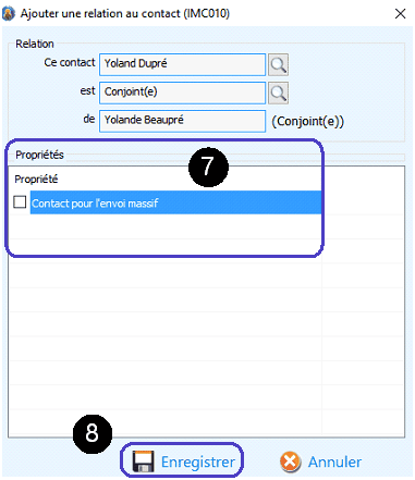 4.La fenêtre « Gestion des contacts » s'affiche. 5.Recherchez le contact dans la liste en inscrivant son nom dans le champ « Nom », cliquez sur l'icone 6.Cliquez sur 7.La fenêtre « Ajouter une relation au contact » s'affiche. Cochez les propriétés que vous désirez attribuer à ce contact.