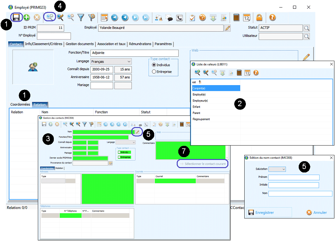Dans l'exemple ci-dessous, nous ajouterons une relation de type individu, qui n'existe pas encore dans PRIM. 1.Dans le dossier de l'employé, sélectionnez le sous-onglet « Relation ». Dans la zone, cliquez sur une ligne blanche ou sur l'icône 2.La fenêtre « Liste de valeurs » s'affiche. Choisissez parmi les éléments proposés. 3.La fenêtre « Gestion des contacts », s'affiche. 4.Cliquez sur l'icône 5.Cliquez sur l'icône 6.Cliquez dans les différentes zones d'édition de la fenêtre « Gestion des contacts » où vous désirez ajouter de l'information. Cliquez sur 7.Cliquez sur 8.Le contact s'affiche dans la zone « Relation ».