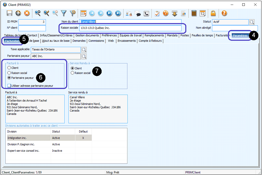 3.Trouvez le client pour lequel le partenaire doit être facturé en effectuant une recherche 4.Cliquez sur l’onglet « Paramètres ». 5.Cliquez sur l’onglet « Facturation ». 6.Cliqez sur l'option « Partenaire payeur ». 7.L'option « Raison sociale » permet d'utiliser le champ situé sous le nom du client. Ce champ permet de spécifier à qui le service a été rendu.