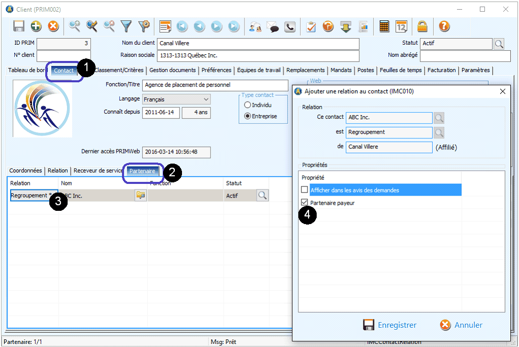 Dans le cas où le partenaire payeur ne serait pas configuré, il est possible de facilement l'ajouter à l'aide de l'onglet « Contact », sous-onglet « Partenaire ». 3.Ajoutez une relation ou modifiez la relation. 4.Sélectionnez la propriété « Partenaire payeur ».