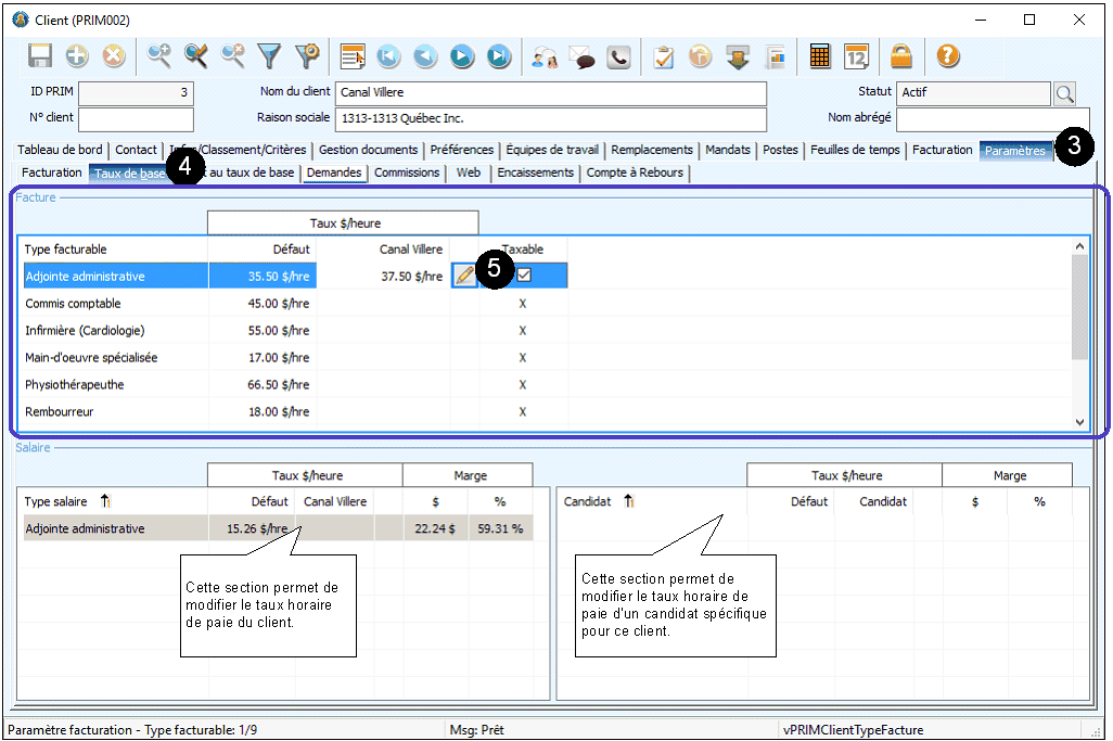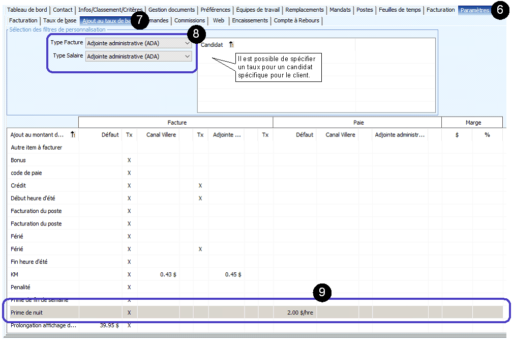 Personnaliser les codes spéciaux6-Cliquez sur l’onglet « Paramètres ». 7-Cliquez sur l’onglet « Ajout au taux de base ». 8-Sélectionnez le « Type Facture » et « Type Salaire » concernés. 9-Sélectionnez le code à modifier et entrez les taux de facturation et de paie désirés.
