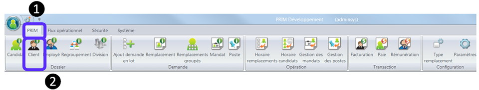 1.Dans le ruban « PRIM ». 2.Cliquez sur le dossier « Client ».