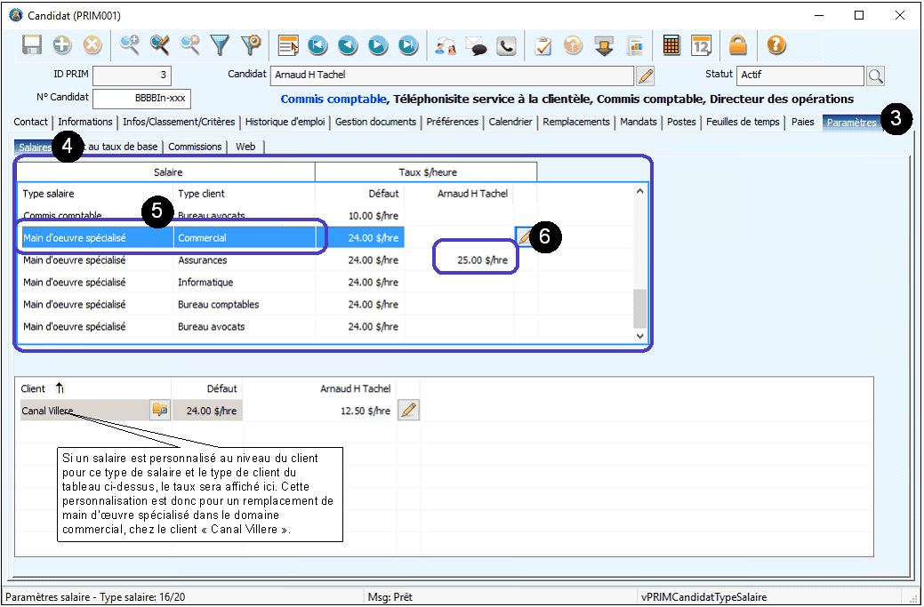 3-Cliquez sur l’onglet « Paramètres». 4-Cliquez sur le sous-onglet « Salaire ». 5-Dans cette section, il est possible de configurer un salaire pour un « Type salaire » pour un type de client spécifique. La valeur de la colonne « défaut» provient de la configuration générale. 6-Sélectionnez la ligne et cliquez sur l’icône « Crayon » afin d’attribuer un salaire différent pour ce candidat seulement.