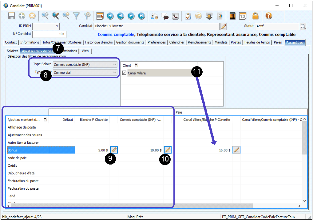 7-Cliquez sur le sous-onglet « Ajout au taux de base ». 8-Sélectionnez le « Type salaire » et « Type client ». Il n'est pas nécessaire de sélectionner un « Type client » si on veut modifier un taux pour un type de salaire qui inclura tous les types de client. 9- Si on veut inscrire un taux pour un type de salaire spécifique, inscrivez le montant dans la colonne portant le nom du candidat en cliquant sur l’icône « Crayon ». 10- Si on veut inscrire un taux pour un type de salaire et un type de client spécifique, inscrivez le montant dans la colonne portant le nom du type de travail en cliquant sur l’icône « Crayon ». 11-Si un taux est configuré pour ce type de salaire au niveau d'un client, il est possible de voir ces taux en sélectionnant le client. Les colonnes seront visibles dans le tableau par la suite.