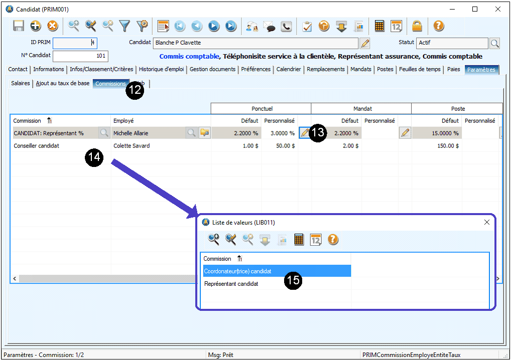 Personnaliser les commissions12-Cliquez sur le sous-onglet « Commissions ». 13-En cliquant sur l’icône « Crayon », il est possible de modifier le taux pour le ponctuel (remplacement), le mandat et le poste. Les données inscrites proviennent de la configuration générale. 14-En cliquant sur une ligne vide, il est possible d'ajouter des codes de commissions qui ne sont pas ajoutés automatiquement. Tout comme la facturation et la paie, les codes de commissions doivent tout d'abord avoir été configuré dans la configuration. Tous les codes actifs pour un candidat seront disponibles lors de l'ajout.