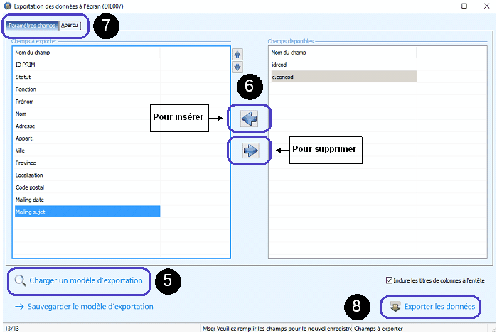 4.La fenêtre « Exportation des données à l’écran » s'affichera. 5.Dans l’onglet « Paramètres champs », s’il y a lieu, choisissez un modèle (voir Créer et sauvegarder un modèle d'exportation de données). 6.S’il y a lieu, ajoutez ou supprimez des champs. 7.Cliquez sur l’onglet « Aperçu » afin de visualiser les données à exporter. 8.Cliquez sur