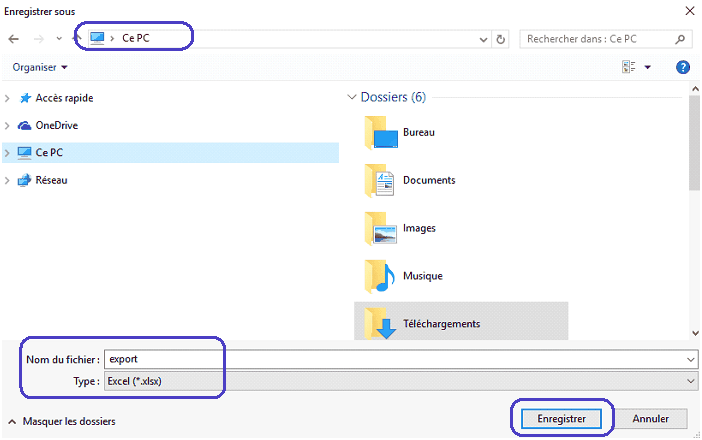 9.La fenêtre de Windows « Enregistrer sous » s’affichera. 10.Sélectionnez l’emplacement et inscrivez le nom du fichier qui contiendra les données à exporter de PRIM. 11.Cliquez sur 12.Vous pouvez maintenant récupérer le fichier dans votre ordinateur à l’emplacement choisi.