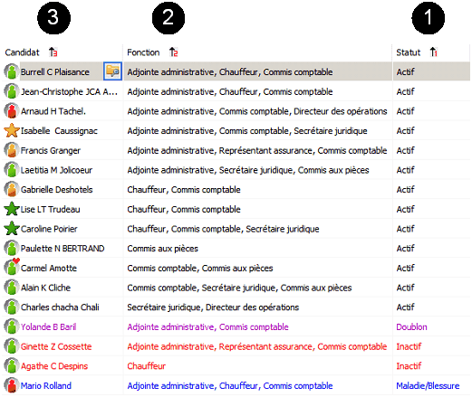 Dans l'exemple ci-dessous, l'utilisateur a fait un tri en 3 étapes et sur 3 colonnes : le statut, la fonction et le nom du candidat.